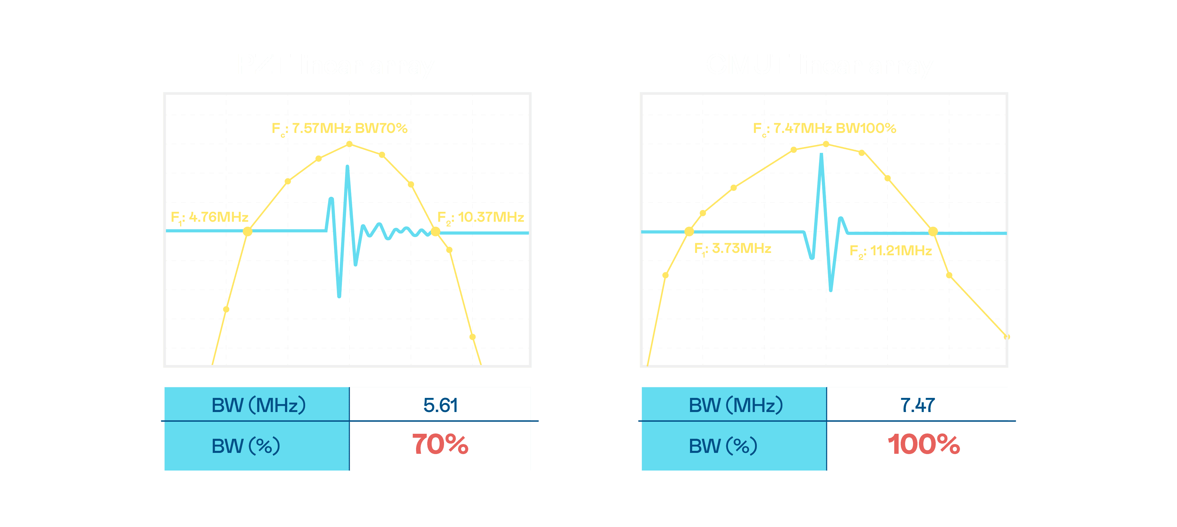 超音波影像的解析度高低,,,,首先取决于探头能发出的讯号频宽。。。尊龙集团 CMUT 可提供高清晰的超音波讯号,,,提供高频宽、、、高灵敏度、、影像纹理细节更高的超音波影像,,,,协助医护人员缩短影像判读时间及利用精准的医疗影像进行诊断。。。。